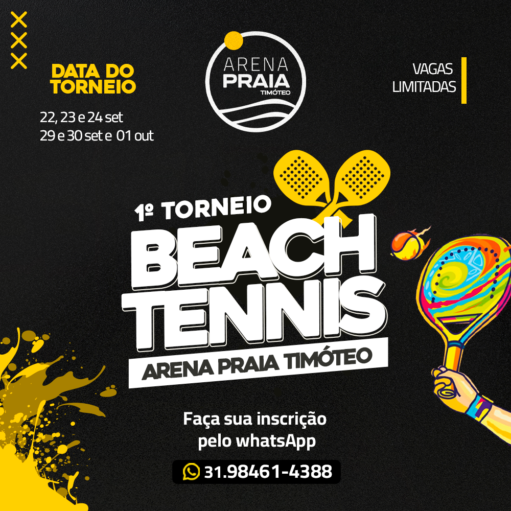 O aguardado 1º Torneio de Beach Tennis da Arena Praia Timóteo está marcado para acontecer nos dias 22, 23 e 24 de setembro, e no final de semana seguinte, nos dias 29 e 30 de setembro, e 1º de outubro. O torneio contará com vagas disponíveis para jogadores iniciantes, intermediários e avançados.