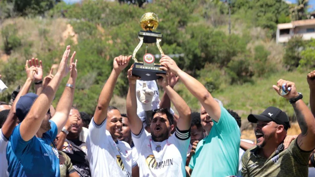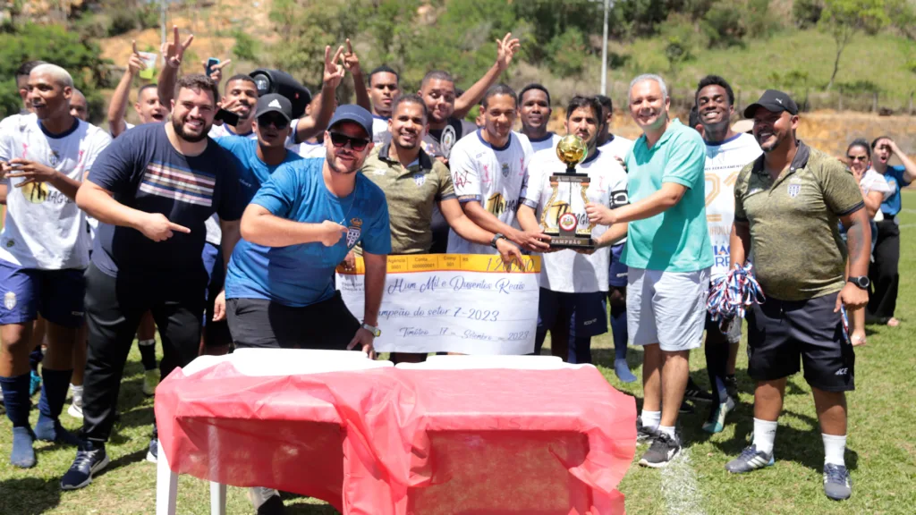 Os jogadores do time do Alphaville comemoram a conquista do Campeonato do Setor 7, edição 2023. A taça de campeão foi erguida no último domingo (17/09), após a vitória por 2 a 0 contra o time do Independente, em partida única da final realizada no Campo do Alegre. A garra e técnica dos jogadores do Alphaville calçaram o caminho da vitória contra o combativo Independente, que ergueu o troféu de vice-campeão. O campeonato é organizado por lideranças esportivas do Setor 7 com o apoio da Prefeitura de Timóteo por meio da Subsecretaria de Cultura, Esporte e Lazer.