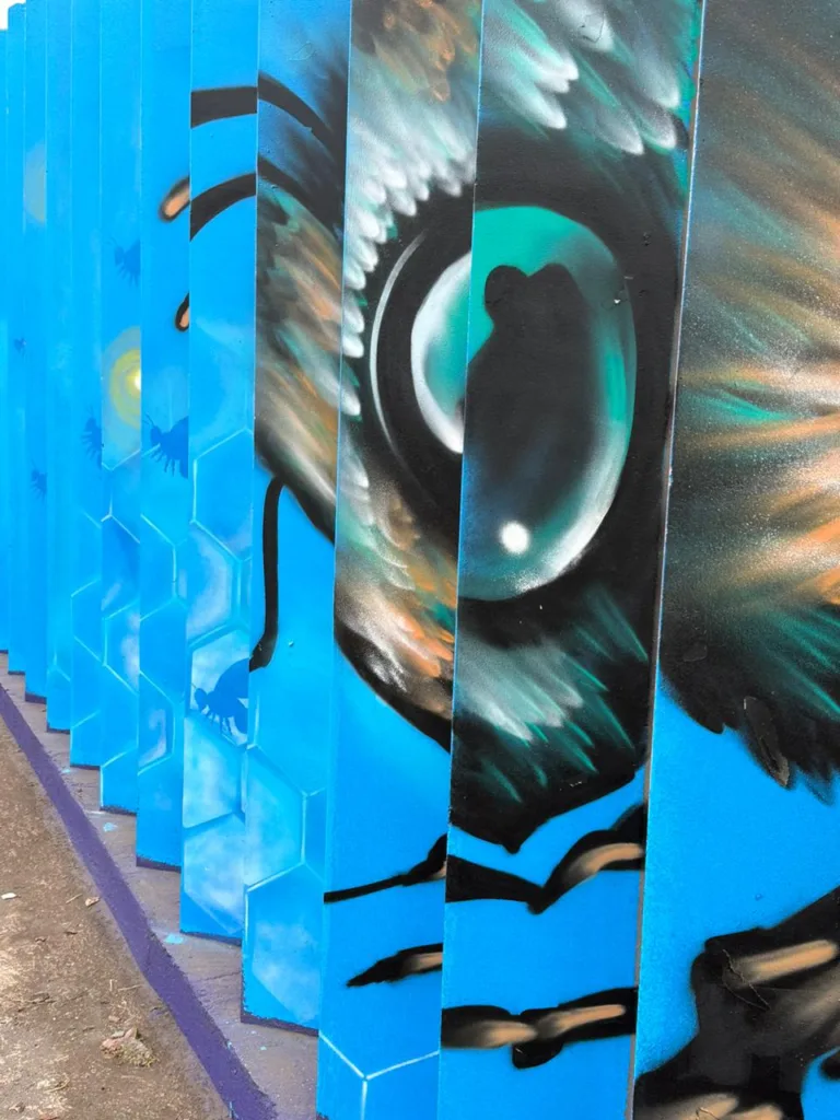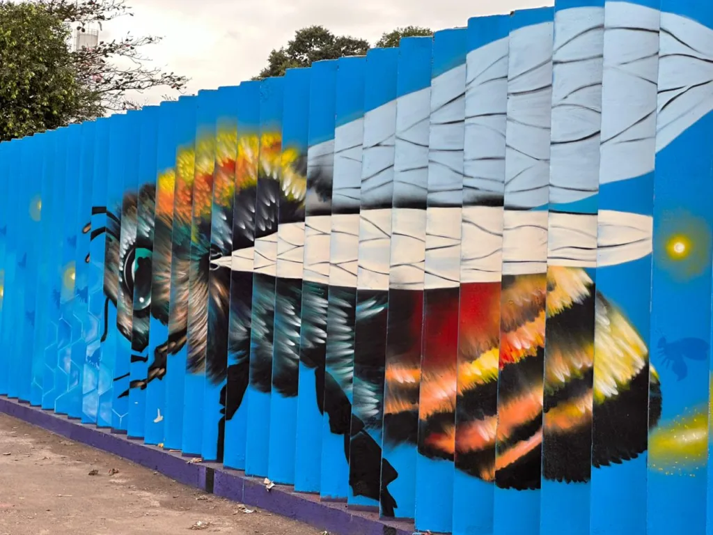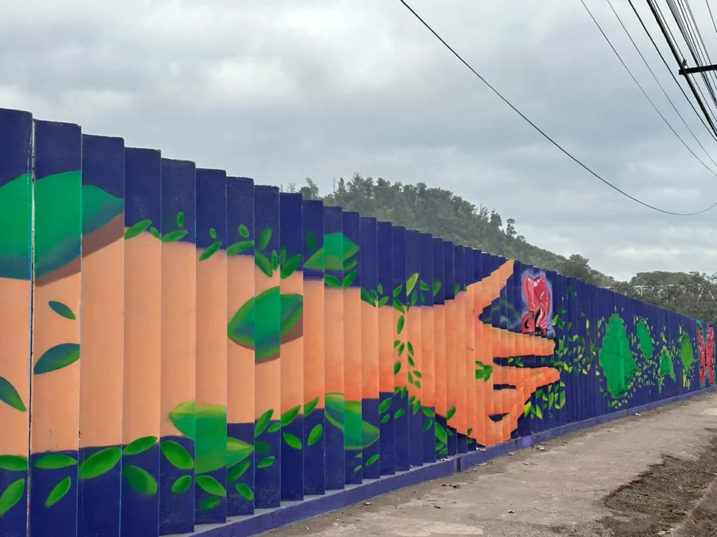 Ao sair da cidade, a pessoa veria a parte da natureza, com mãos soltando folhas que percorrem todo o muro, retratando pássaros, mostrando DNA e transbordando em cores vibrantes, incluindo araras. Essa linda composição dá forma a uma frase escrita com folhas que expressa o conceito de vida.