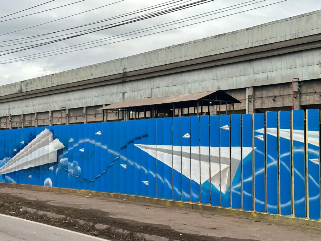 A arte em questão é uma verdadeira celebração visual, apresentando diversas imagens cativantes, como um avião de papel, um beija-flor, um pássaro azul, um papagaio, borboletas, flores e até mesmo um braço com uma mão estendida, culminando com a logomarca icônica da APERAM, estrategicamente posicionada próxima ao ponto de ônibus.