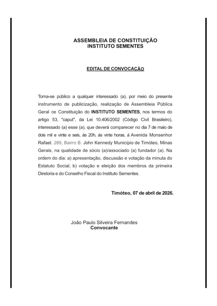 Um novo projeto voltado à organização social e ao desenvolvimento comunitário está prestes a nascer em Timóteo. Foi publicado nesta terça-feira (7) o edital de convocação para a Assembleia Geral de Constituição do Instituto Sementes.