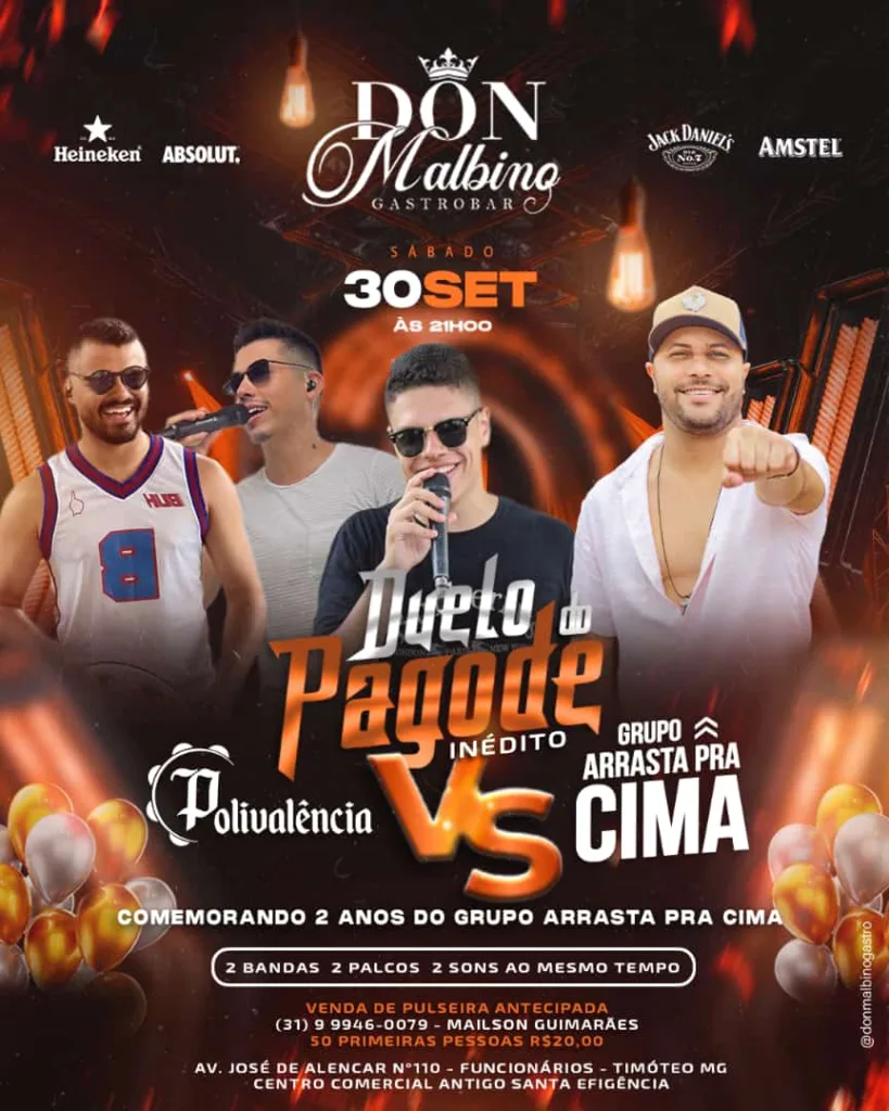 No próximo dia 30 de setembro, a partir das 21h, o Don Malbino, será palco dessa disputa musical que promete entrar para a história da cidade. Os fãs de pagode terão a oportunidade de curtir os maiores sucessos dessas duas talentosas bandas em um evento fechado e exclusivo.