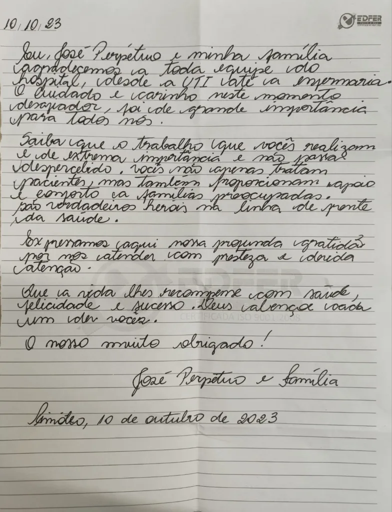 Como forma de retribuir toda a atenção recebida, José Perpétuo juntamente com a sua família endereçou uma cartinha escrita de próprio punho para os profissionais do HMT em agradecimento a todos que cuidaram dele durante a sua estadia no hospital. “Agradecemos a toda a equipe do hospital, desde a UTI até a enfermaria, pelos cuidados e carinho neste momento desafiador. Isso foi de grande importância para nós”, diz um trecho da missiva.