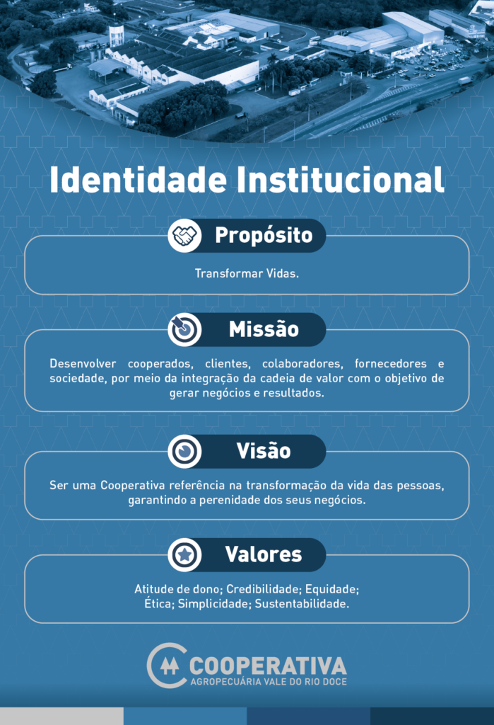 Em 2023, a Cooperativa Agropecuária Vale do Rio Doce iniciou a maior revisão de Planejamento Estratégico de sua história, visando aprimorar sua gestão e alcançar resultados ainda mais expressivos. A partir da revisão, a Cooperativa atualizou sua identidade institucional, alinhando a ideologia da instituição aos novos objetivos de crescimento e desenvolvimento.